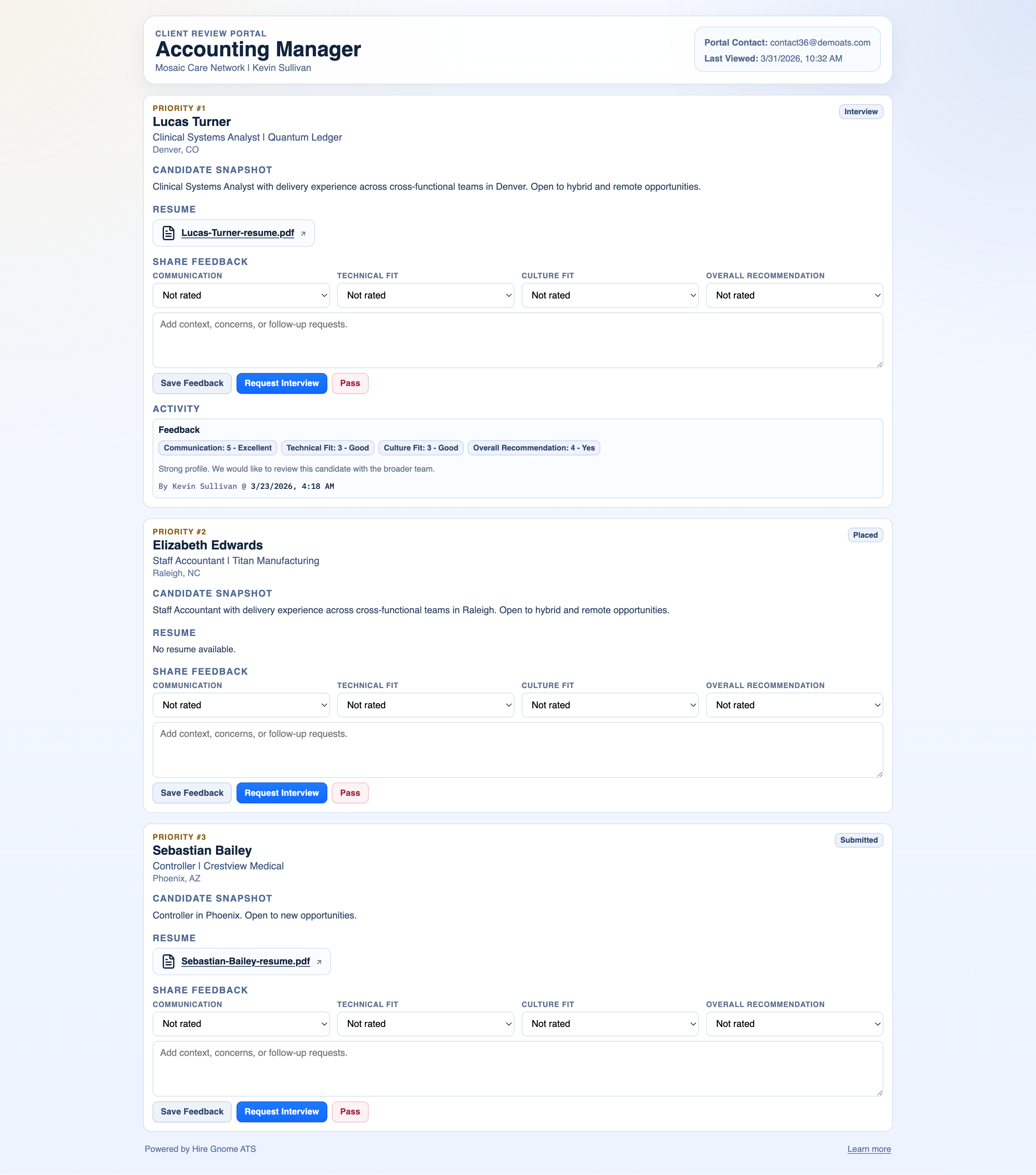 Each job order contact gets a persistent magic-link portal — no login required. Clients can review candidates, read recruiter write-ups, download the primary resume, leave comments, request interviews, or pass. Responses write back to Submission Detail and trigger in-app and email notifications. Portal lifecycle analytics track sent, opened, last viewed, and client actions — all from the job order.