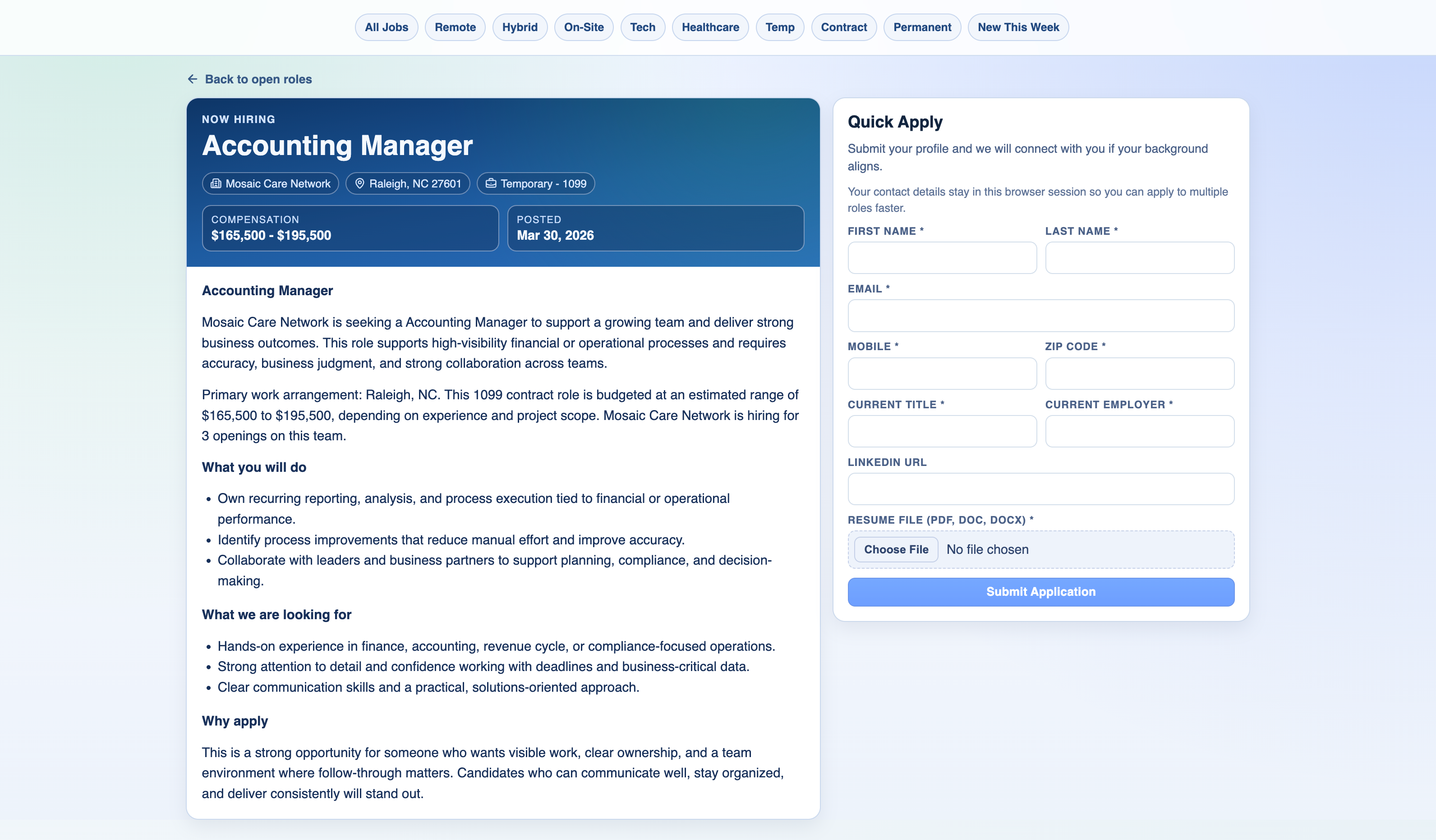 Built-in, toggleable career site with quick apply and resume upload. Web applicants stay separate from recruiter-curated submissions and are hidden from clients until a recruiter promotes them — no accidental exposure.